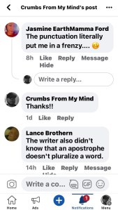 Crumbs is about sharing thoughts and truths, if you notice a non truth, please kindly make it known to Crumbs. We have/do received some notice(s) of hate speech, account being disable, graphic images/content, oversight reviews and even punctuation/apostrophe . Crumbs will grow and keep sharing thoughts and truths.